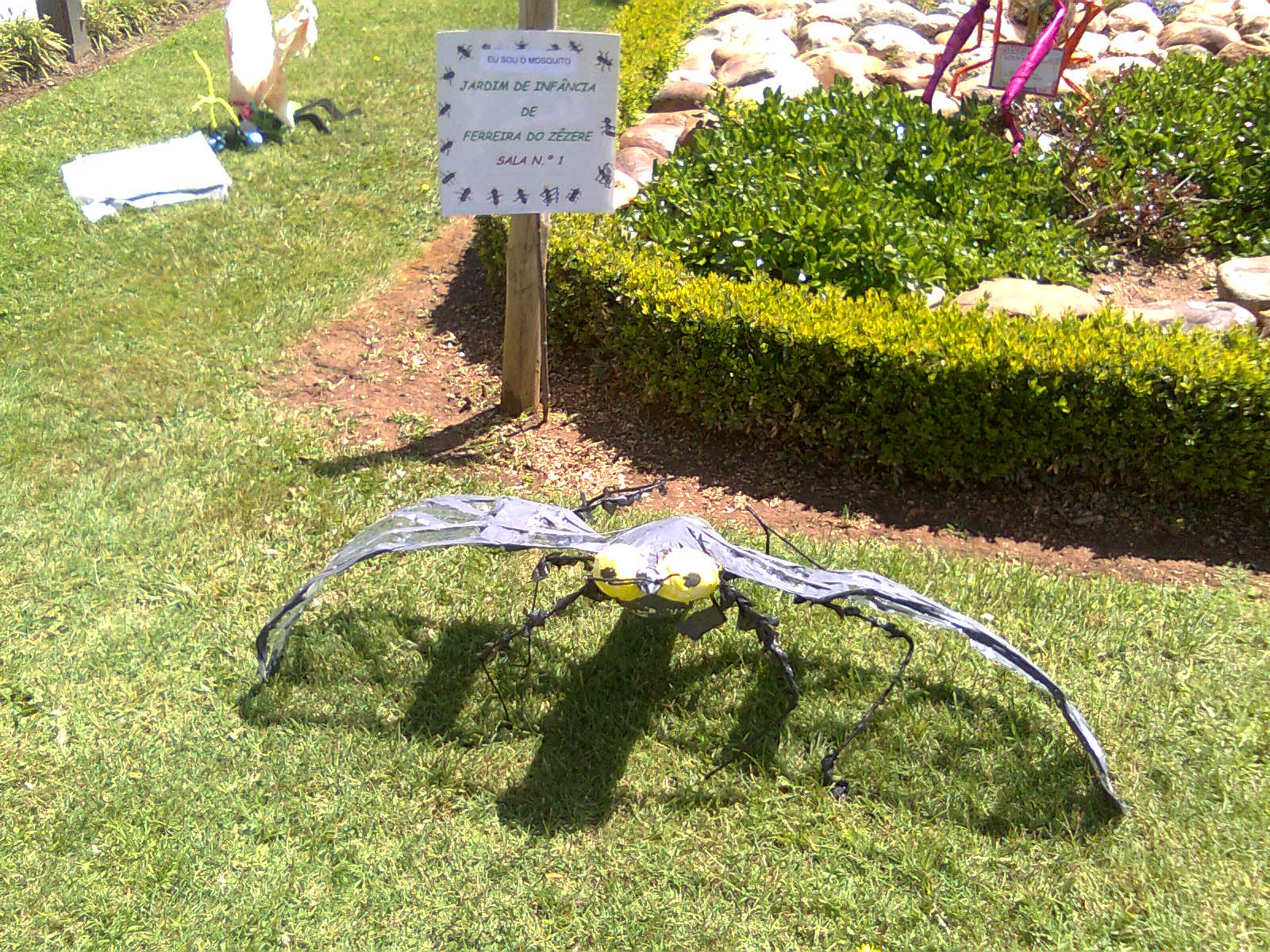 No jardim da vila há arte espalhada no meio da relva e das flores, local onde habitam as personagens desta exposição tão curiosa. Moscas, mosquitos, formigas, libelinhas e outros que tais em formato gigante feitos de material reciclável.